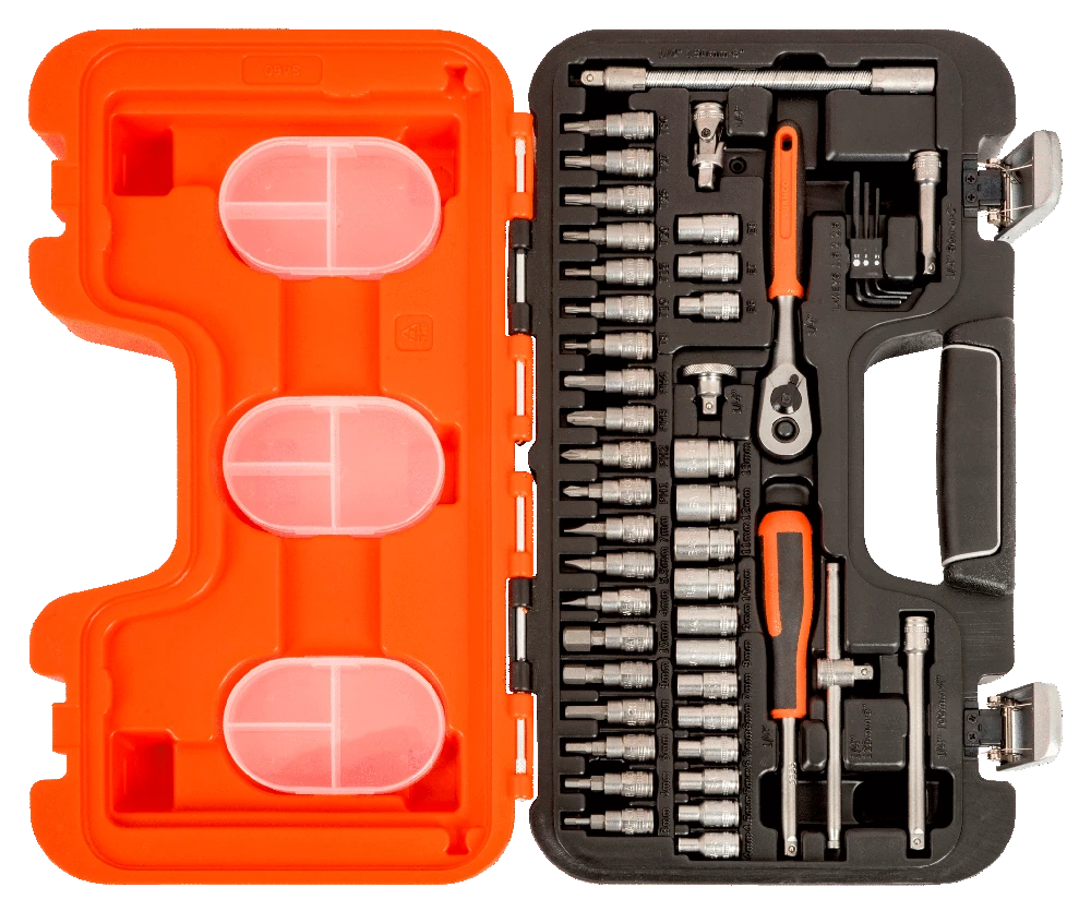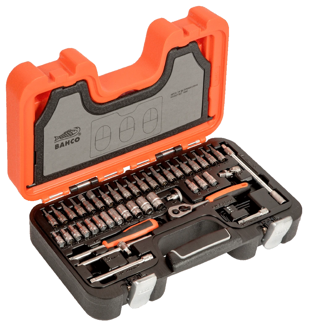 Lækkert og flot værktøjskasse fra Bahco med et stort udvalg af toppe samt en topnøgle og topskruetrækker.