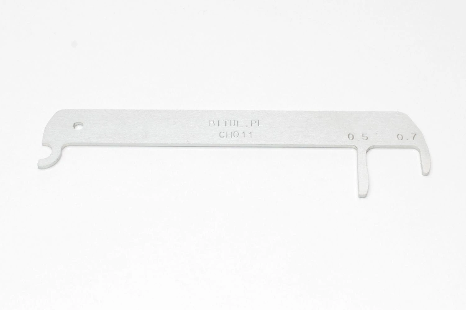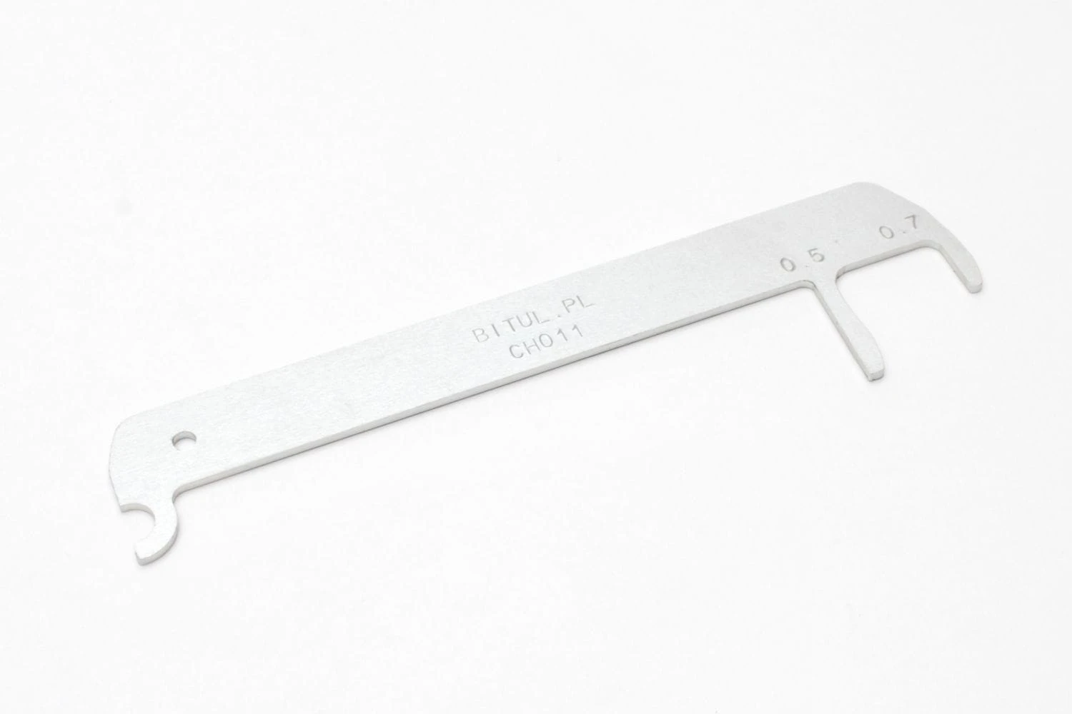 Lavet af 2 mm stål, længde 165 mm med hul til at hænge værktøjet op.