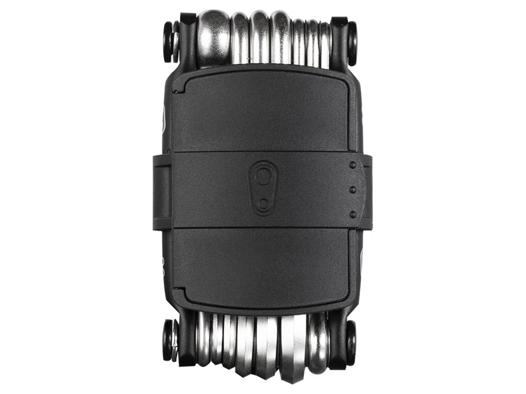 Multiværktøj fra Crankbrothers med 20 forskellige stykker værktøj, inklusiv et integreret dæk plug værktøj, samt opbevaring til plugs og ekstra kædelink.