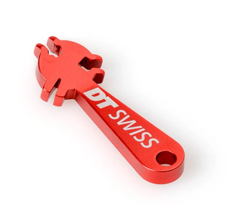 Multifunktionel nippelnøgle fra DT Swiss i rød. Nøglen passer til flere forskellige nipler.