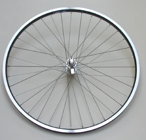 Forhjul med sort fælg i aluminium. Med nav i blank aluminium og med 36 stk. rustfri ståleger, 2 mm tykke. Hjulet er med hurtig bespænding.