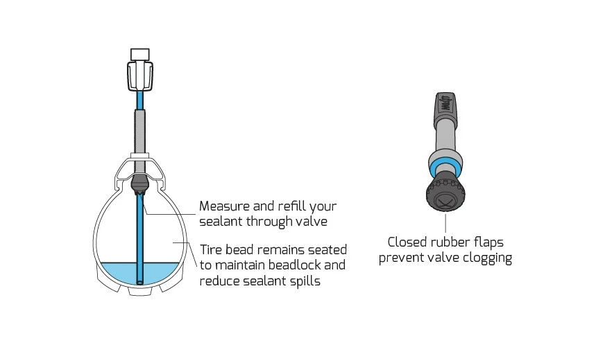 Ventilerne bliver ej heller tilstoppede af væsken da de er lavet med en selvlukkende gummiflap på indersiden som holder tubeless væsken ude af ventilen.