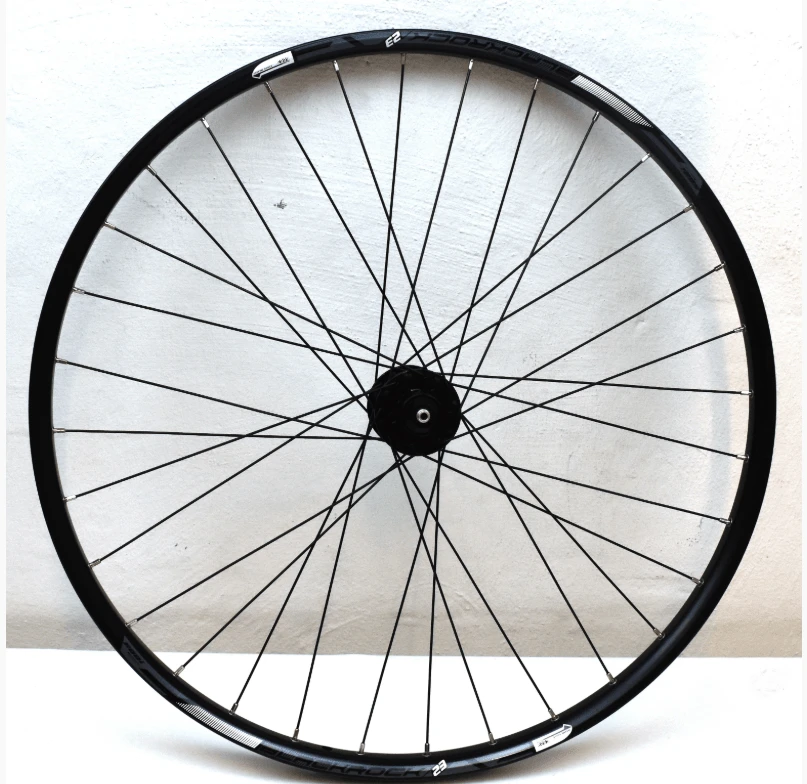 Forhjul fra Rodi. Fælg Blackrock 23 sort 32 Huls. Sort nav, fælg og eger – Til skivebremser. Thru Axle (15×100).