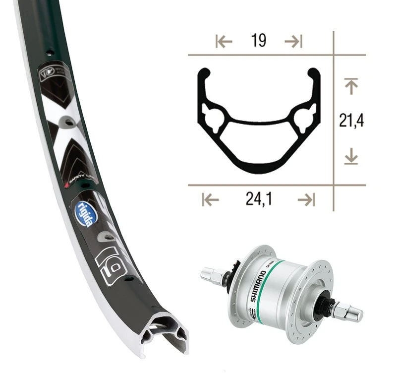 Forhjul med Shimano Nexus dynamo nav og Rigida fælg.