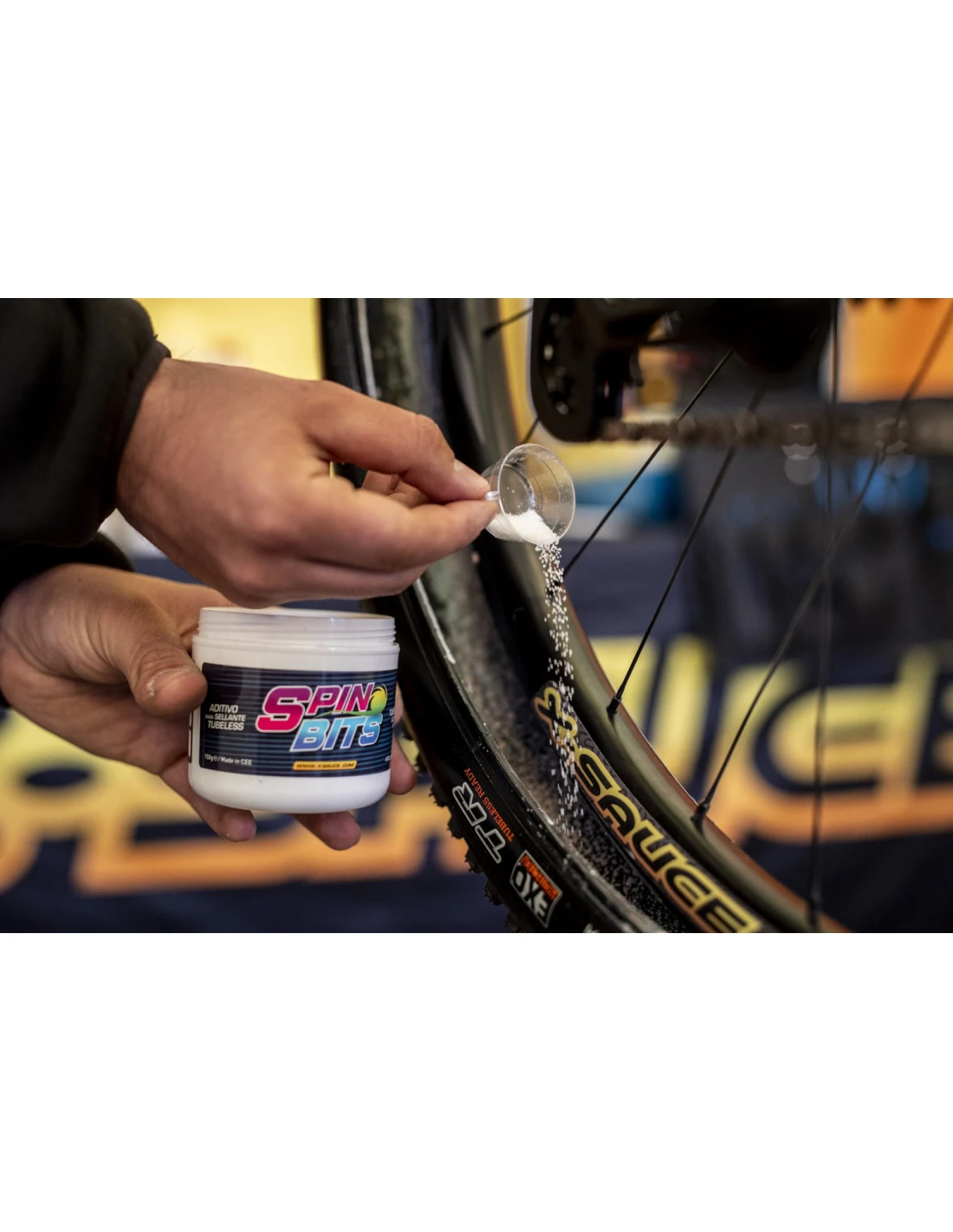 SpinBits er et “add-on” til din tubeless sealant. Granulatet gør det nemmere og hurtigere at lappe større huller. Vægten øges kun minimalt, til gengæld lapper væsken, sammen med granulatet meget hurtigere – så du slipper for at holde stille længere end højst nødvendigt.
